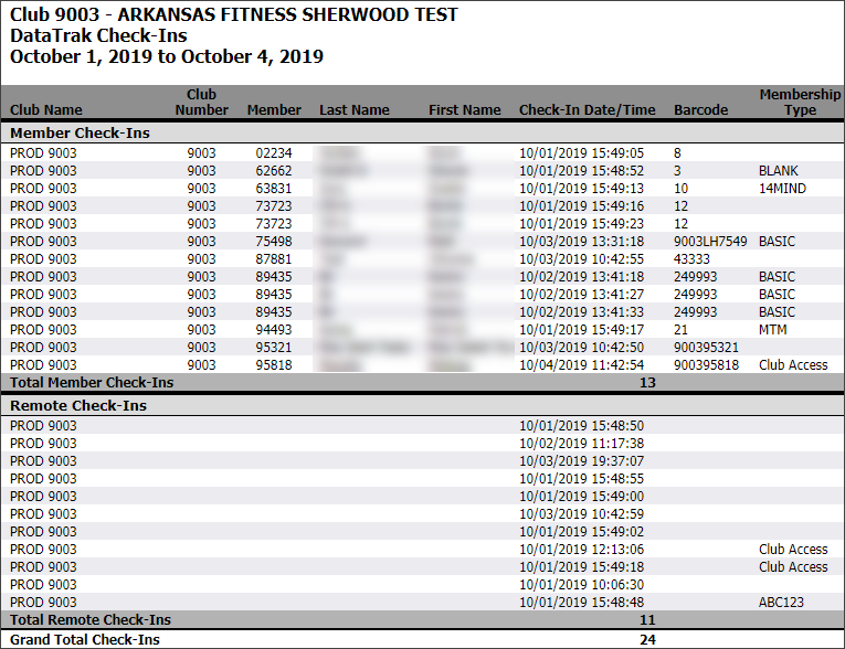 - The Member Check-Ins section lists each member and the date and time of the check-in. Member check-ins are organized by member number.