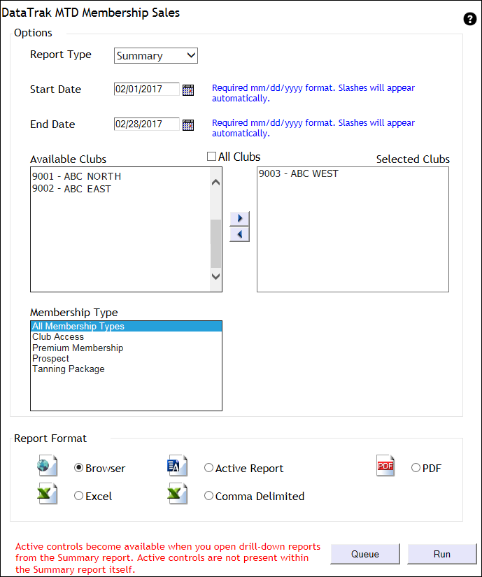 Clubs that do not have data for the time parameter selected will be suppressed from the report. If no data is found for all clubs selected, the system will notify you that no records were found.