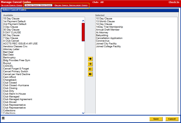 Move the desired cancel codes from Available to Selected in order to list them as options for the member's Reason for Cancelling on the Online Cancellation Request Form.