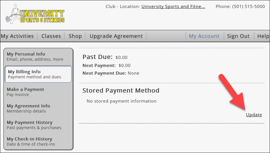 The My Billing Info page includes information about your past due amounts, upcoming payments, and your stored payment method.