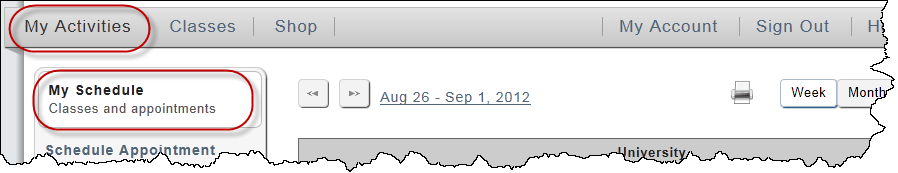 - Click Week to show a weekly schedule or Month to show a monthly schedule.