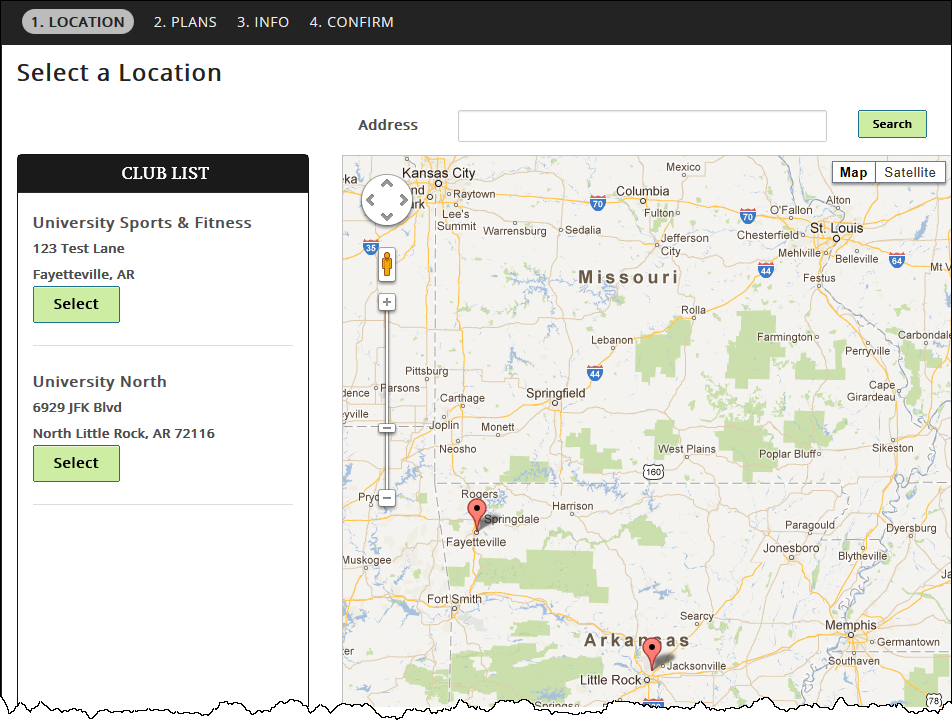 The Location page uses Google Maps to assist you in finding the club that is most convenient for you.