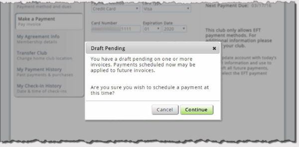 "You have a draft pending on one or more invoices. Payments scheduled now may be applied to future invoices. Are you sure you wish to schedule a payment at this time?"
